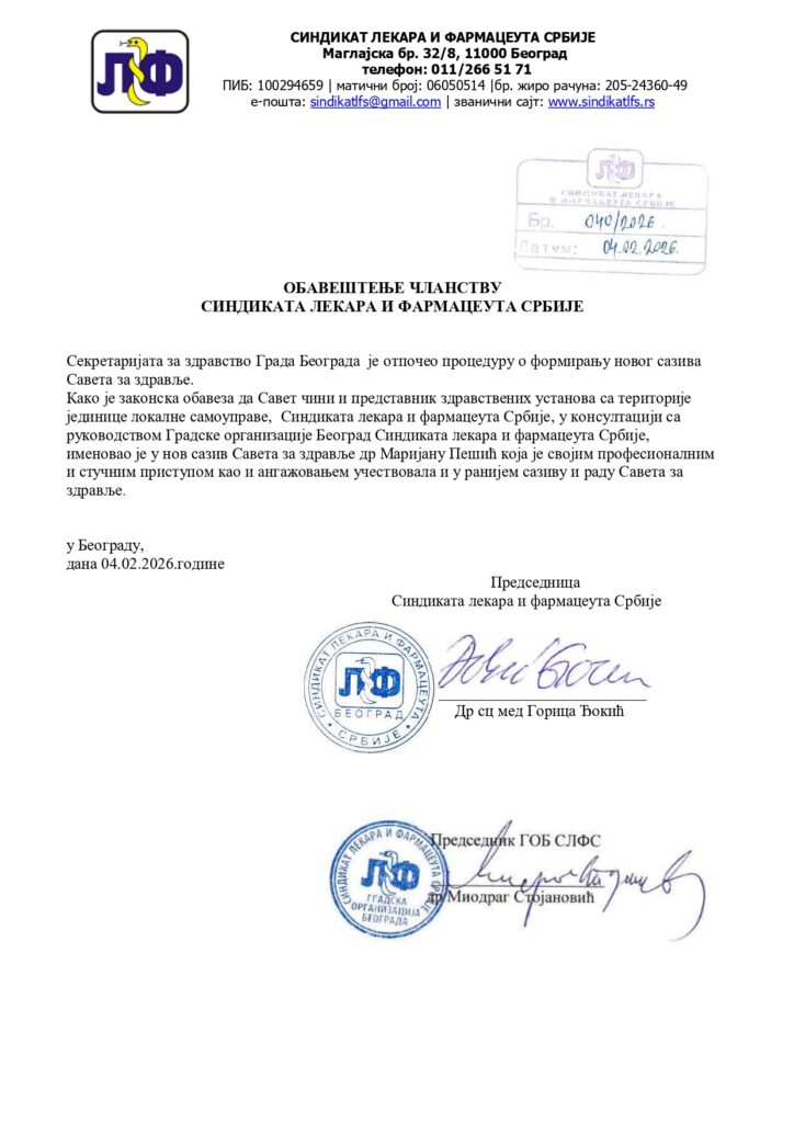 - Саопштење за јавност и чланство Синдиката лекара и фармацеута Србије February 12, 2026