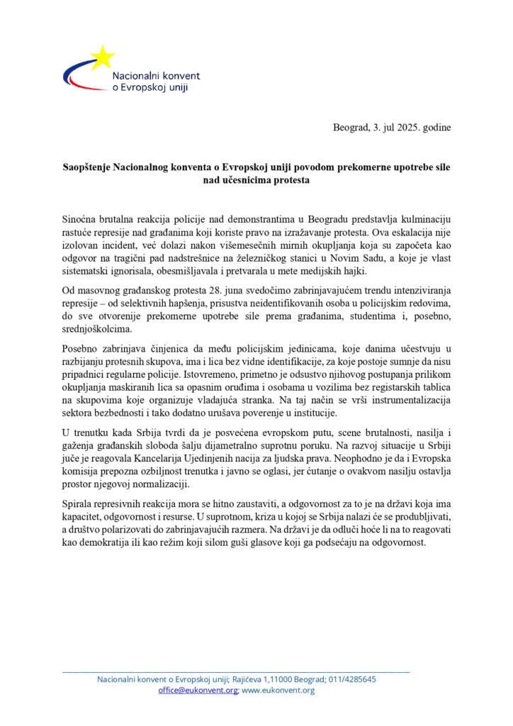 Saopštenje Nacionalnog konventa o Evropskoj uniji povodom prekomerne upotrebe sile nad učesnicima protesta